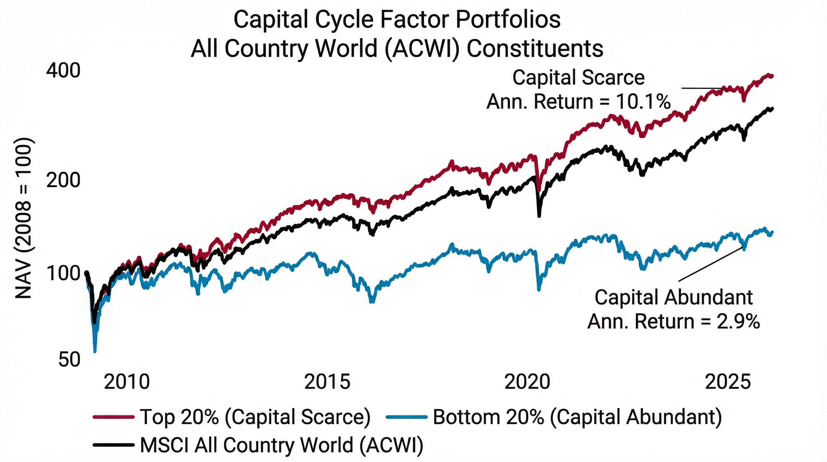 We categorized stocks globally into "Scarce" and "Abundant" buckets and the top 20% most capital-scarce stocks have outperformed the bottom 20% by 7%+ a year (gross).